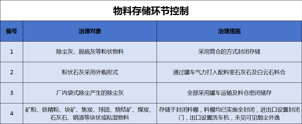 丹阳龙江钢铁有限公司涉及的粉状物料主要包括除尘灰、脱硫灰、石灰等粉状物料。粉状物料均采用筒仓的方式封闭存储,全厂共计8个,块状或粘湿物料存储的料场(棚)共计7处,料棚均已实施全封闭,进出口设置封闭门,出口设置洗车机,未见可见烟尘外溢。