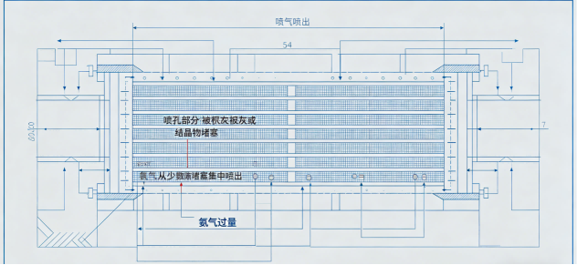 SCR脱硝的核心在于氨气与烟气的均匀混合。喷射格栅的喷孔若被积灰或结晶物堵塞,氨气只能从少数喷孔喷出。这将导致局部区域氨气过量、氨逃逸超标,而另一部分区域氨气不足、NOx排放超标,企业陷入“两头不讨好”的困境。