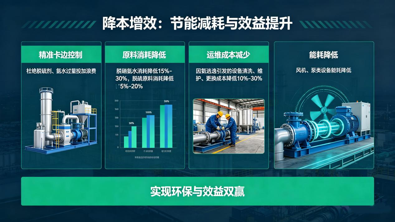 通过精准卡边控制,杜绝脱硫剂、氨水过量投加浪费,脱硝氨水消耗降低15%-30%,脱硫原料消耗降低5%-20%;减少因氨逃逸引发的设备清洗、维护、更换成本,设备运维成本降低10%-30%;同时降低风机、泵类设备能耗,实现环保与效益双赢。