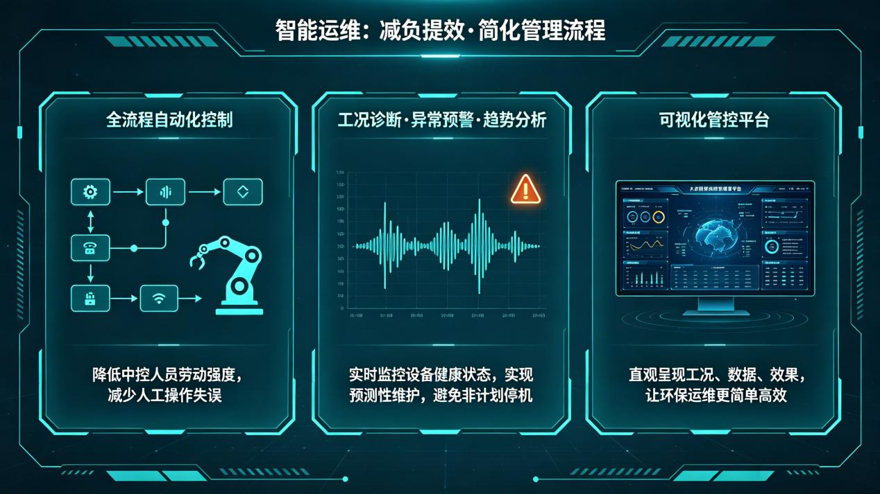 全流程自动化控制,大幅降低中控人员劳动强度,减少人工操作失误;系统自带工况诊断、异常预警、趋势分析功能,实时监控设备健康状态,实现预测性维护,避免非计划停机;可视化管控平台直观呈现工况、数据、效果,让环保运维更简单、更高效。