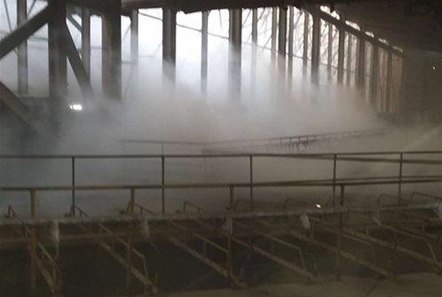 干雾抑尘系统正是应用这一原理,利用压缩空气和水通过超声波喷嘴形成10μm以下的人造雾微雾颗粒,而由于雾滴微细,部分雾滴会在空气中迅速蒸发,使局部空间中的相对湿度迅速饱和,饱和后的水汽会以尘粒为核凝,使尘粒直径不断增大,并在自身重力作用下沉降,达到降尘抑尘的作用。