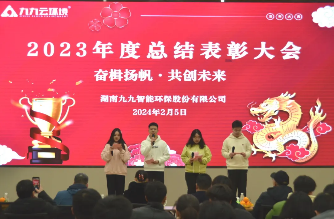 2024年2月5日,九九智能环保以“奋楫扬帆,共创未来”为主题的2023年总结表彰大会隆重举行,对过去一年为公司发展做出重要贡献的优秀员工予以表彰,同时对2024年工作作出展望和重要部署。九九总部及子公司全体员工欢聚一堂,部分依然奋战在项目一线的员工通过直播共同见证了这美好的时刻。